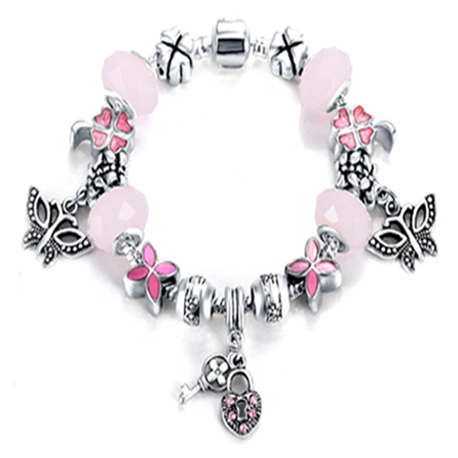 VPKJewelry Lock Key Butterfly Murano and Austrian Crystal Charm Bracelet Beads Chain Silver Plated