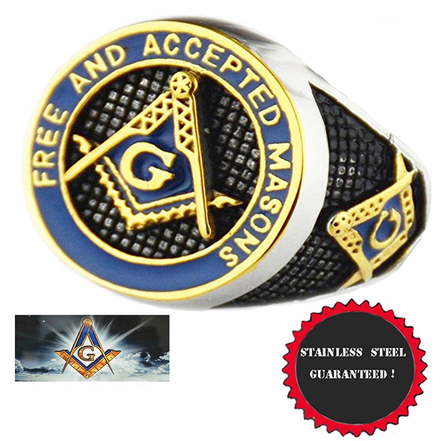 Men's F. & A.M. Masonic Mason Blue Enamel Gold Plated Polished Stainless Steel rings sz 7 -14.5
