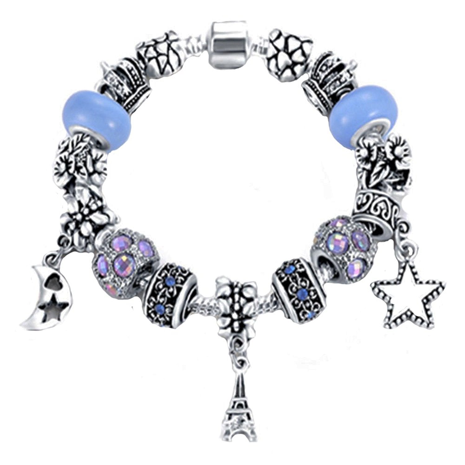 VPKJewelry Women Cirl Moon Star Bead Murano and Austrian Crystal Charm Bracelet Silver Plated